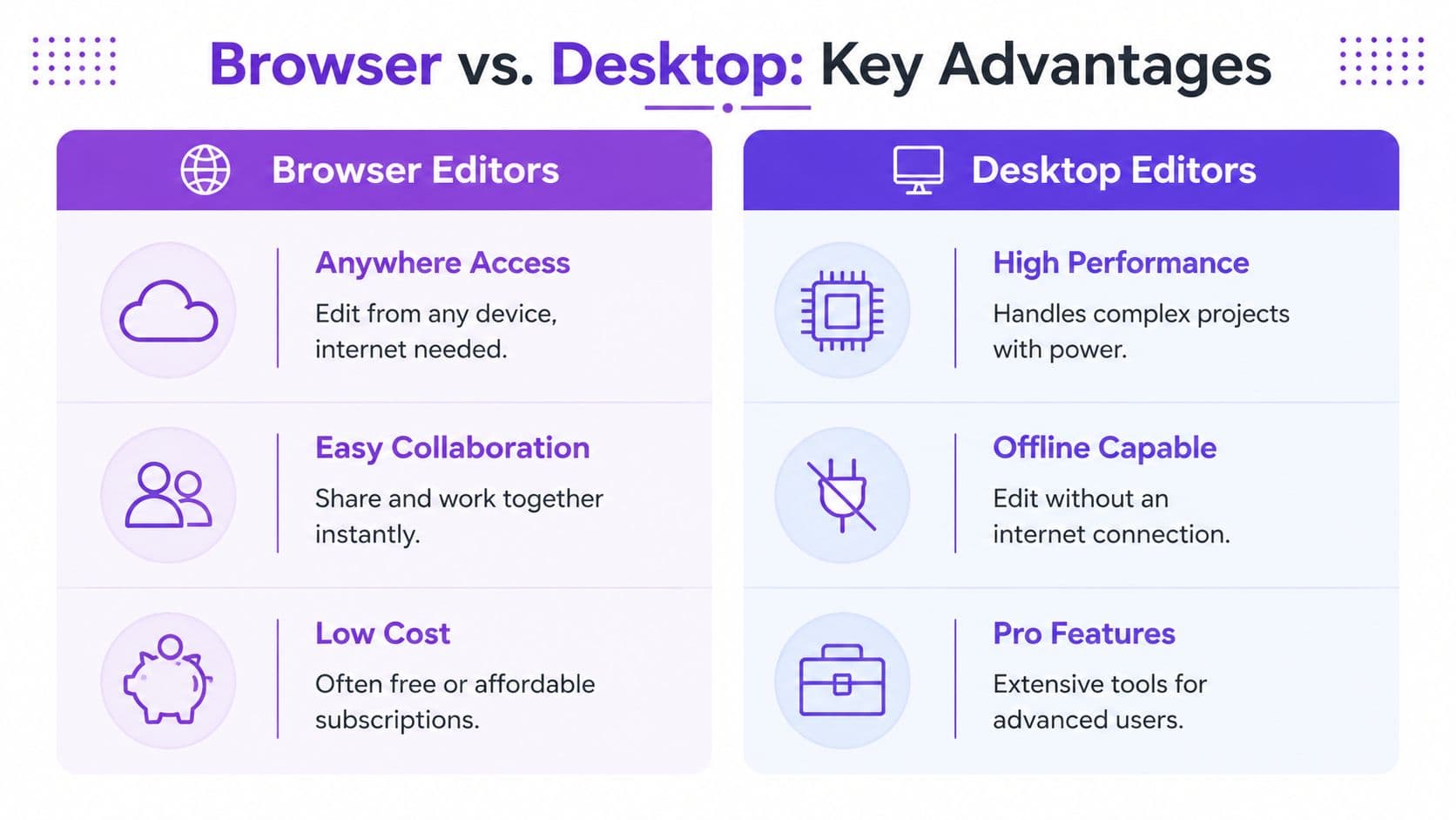 - Hardware limits: No-install editing is easier on people using everyday machines.