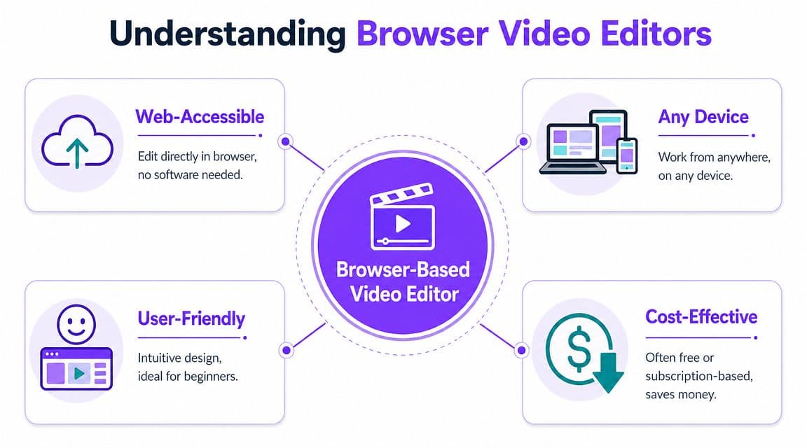 A browser based video editor is video editing software that runs inside your web browser instead of as an installed desktop program. You go to a website, log in, and edit there. For a creative workflow like lyric or karaoke videos, that matters because the job often revolves around timing text, testing small changes, and getting a clean export without turning your computer into a full production studio.