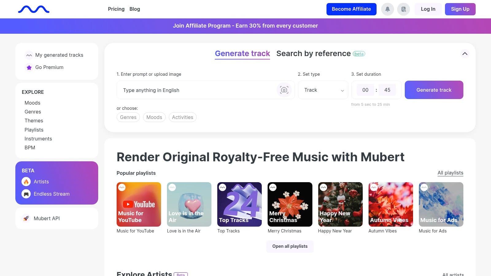 While Mubert Render excels in speed and ease of use, it's important to be aware of its limitations. Customization options are less extensive compared to traditional video editing software. The platform operates on a subscription-based pricing model, and a stable internet connection is essential for all functionalities. Additionally, some AI-generated visuals may share similarities.
