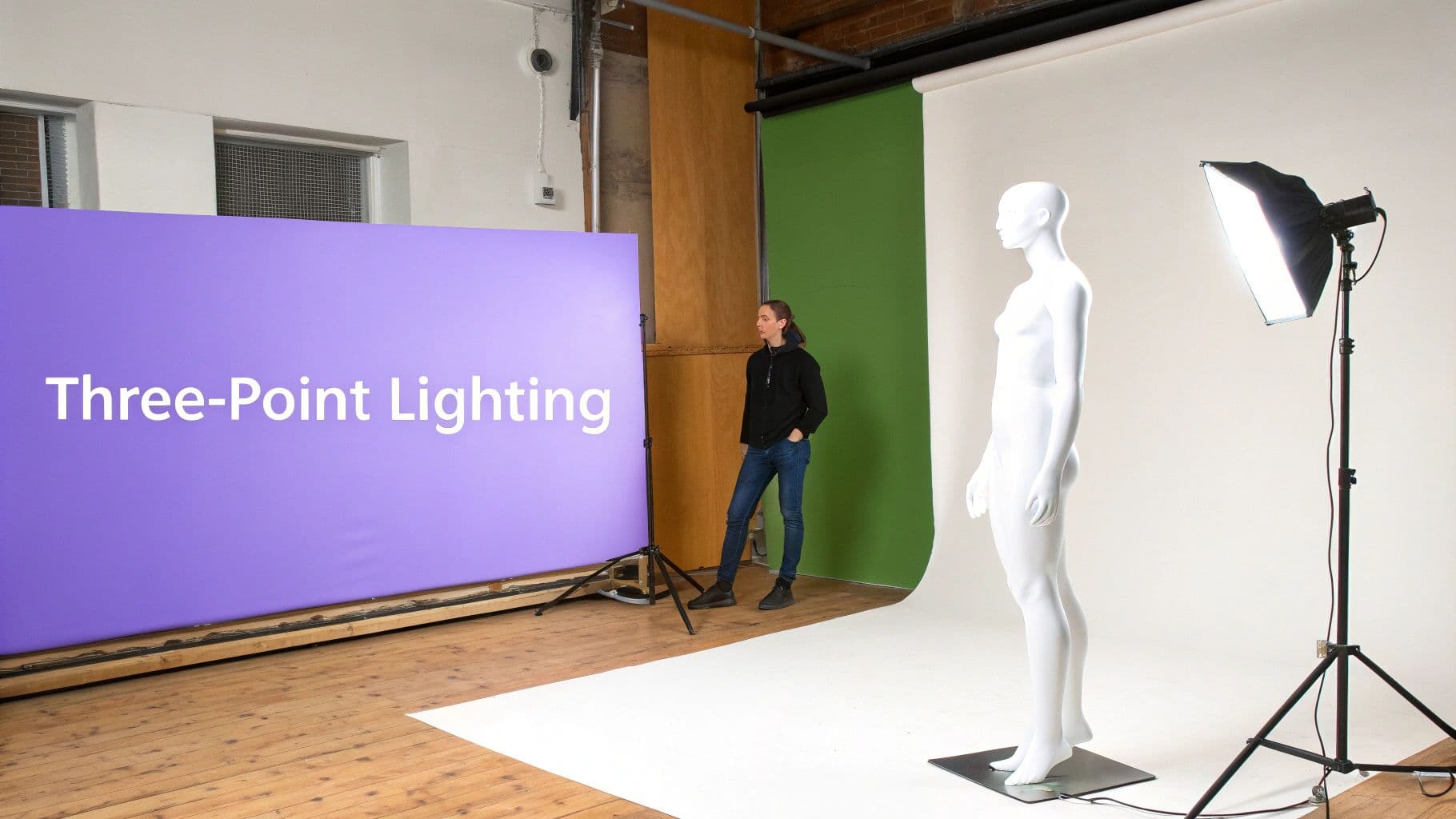 This technique uses three distinct light sources: a key light (the main light on the subject), a fill light (to soften shadows created by the key), and a back light (to separate the subject from the background). Mastering this balance is one of the most impactful video production best practices you can adopt, elevating everything from a simple lyric video background to a full-scale music video performance.
