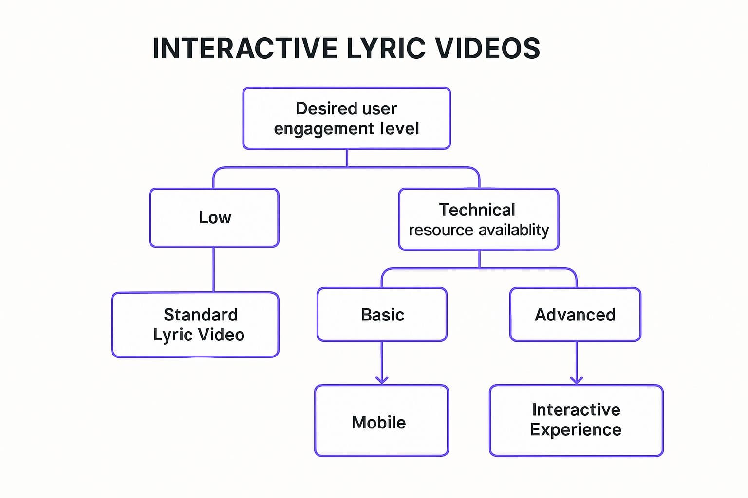 This decision tree guides creators through the process of determining if an interactive lyric video is the right choice. If you’re aiming for high user engagement and have advanced technical resources, an interactive experience is ideal, especially if focusing on desktop platforms. However, if resources are limited or mobile compatibility is crucial, a standard lyric video might be a more practical approach.